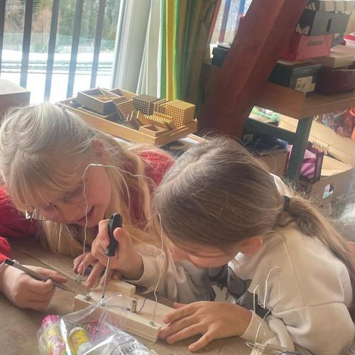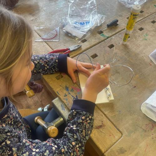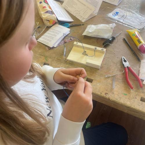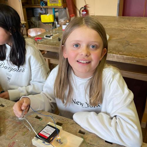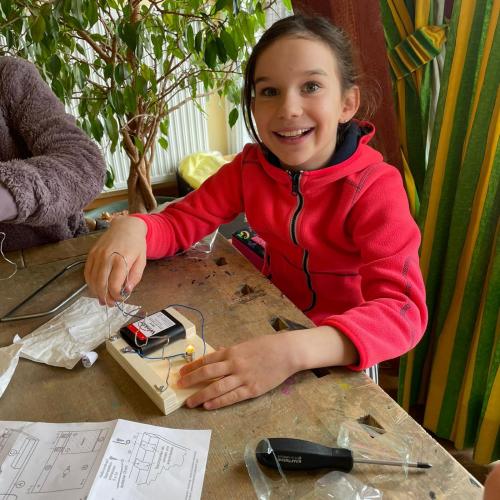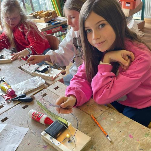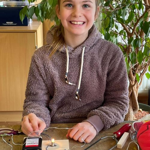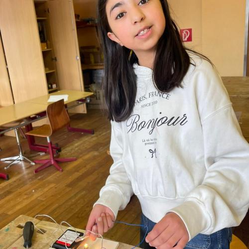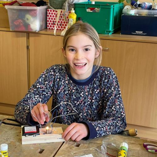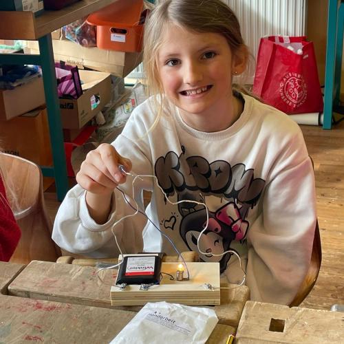Im Werken haben die Kinder gelernt, wie man einen einfachen Stromkreis baut, um eine Glühbirne zum Leuchten zu bringen. Dabei haben sie Schritt für Schritt ausprobiert, wie Strom fließt und was alles dazu nötig ist.