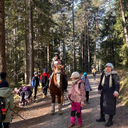 Im Anschluss bekam jedes Kind eine Semmel und einen Saft, bevor sich die Gruppe wieder zu Fuß auf den Heimweg machte. Ein besonderes Highlight am Rückweg war die unerwartete Pferdebegleitung, die für strahlende Gesichter sorgte.