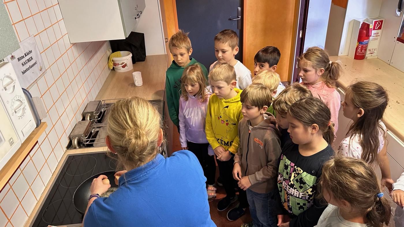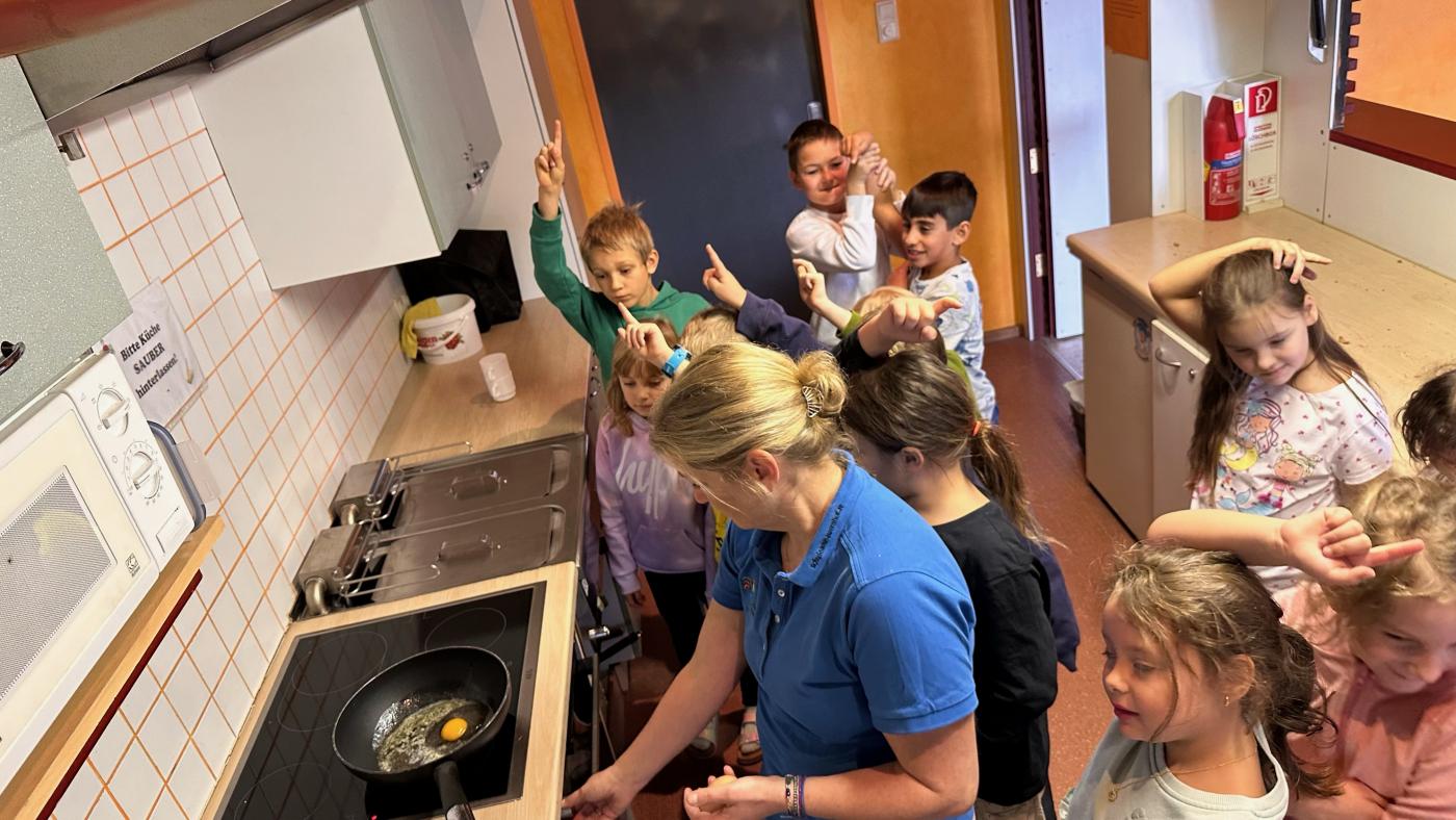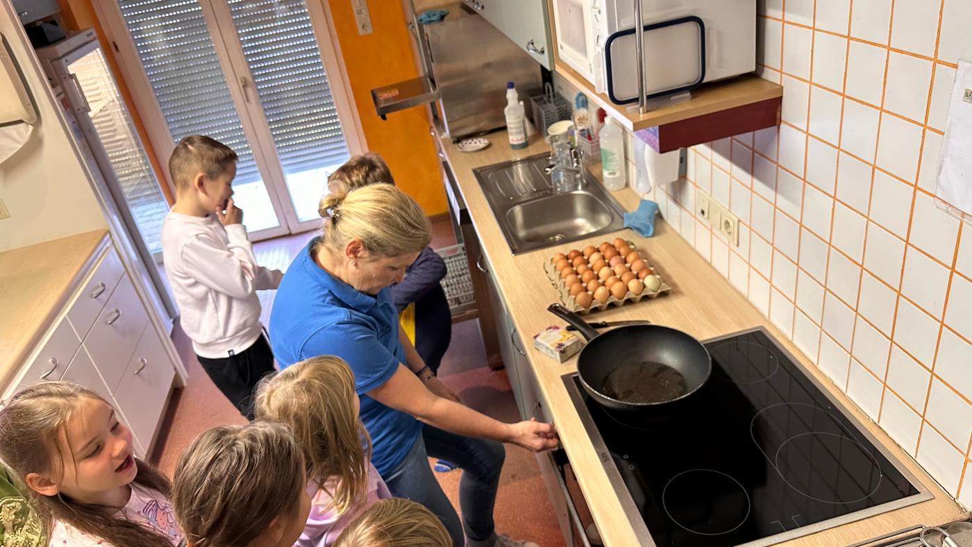 Nach der Theorie ging es dann ans Praktische: Jedes Kind durfte ein Ei in die Pfanne schlagen und daraus ein leckeres Rührei zubereiten. Das war nicht nur lehrreich, sondern auch ein großer Spaß, und das Ergebnis – frisches Rührei – wurde begeistert verspeist.