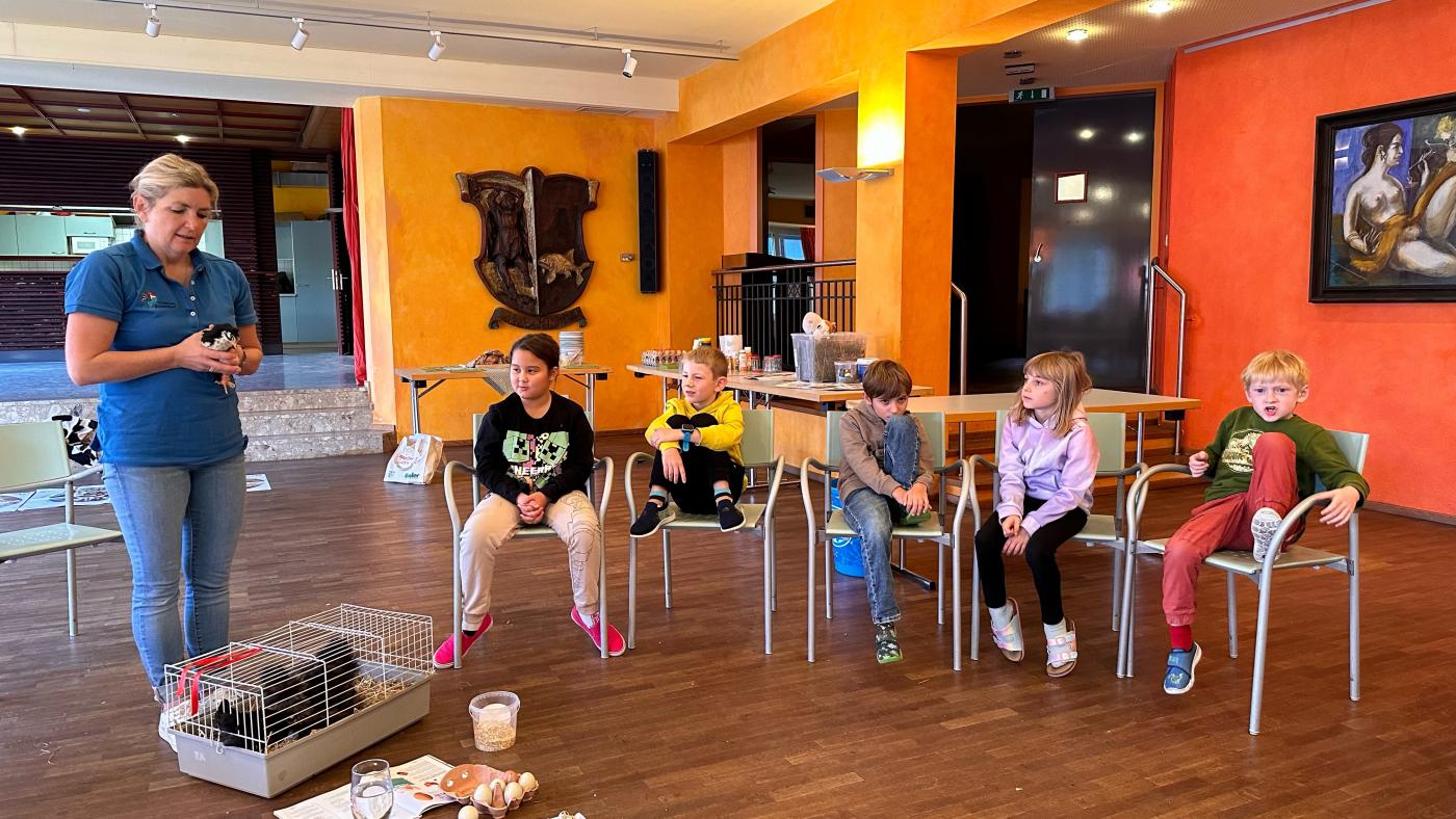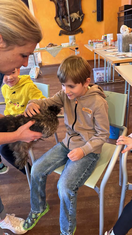 Unter dem Motto „Vom Huhn zum Ei“ erklärte Frau Eder den Kindern die spannende Entwicklung eines Eies. Sie zeigte ihnen anschaulich, wie ein Ei entsteht und wie Hühner artgerecht gehalten werden. Als besonderes Highlight brachte sie sogar einige ihrer Hühner mit, die von den Kindern gestreichelt und gefüttert werden durften. Dies ermöglichte es den Schülerinnen und Schülern, die Tiere hautnah zu erleben und eine Verbindung zur Herkunft ihrer Lebensmittel aufzubauen.