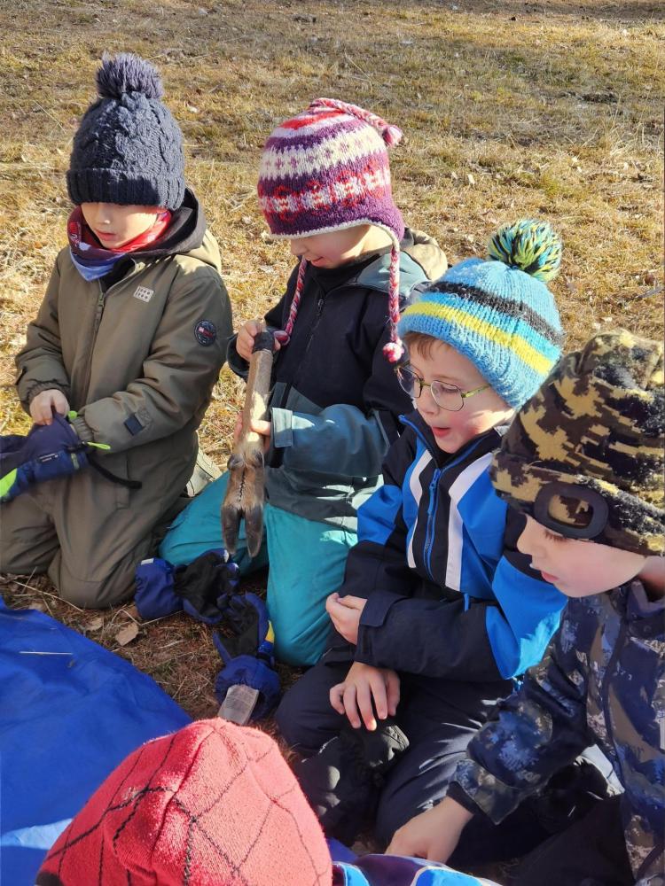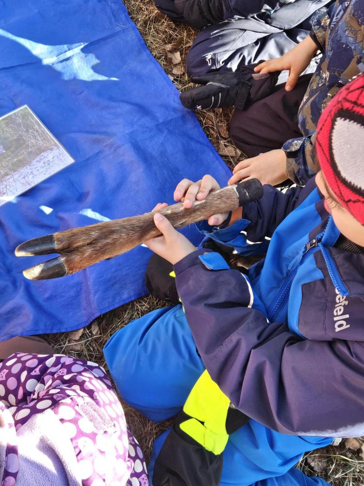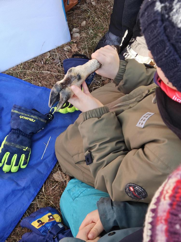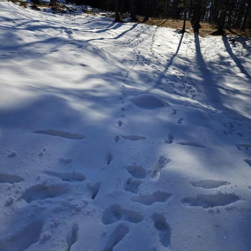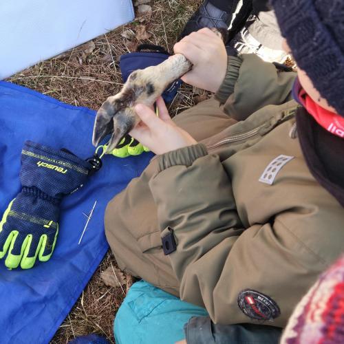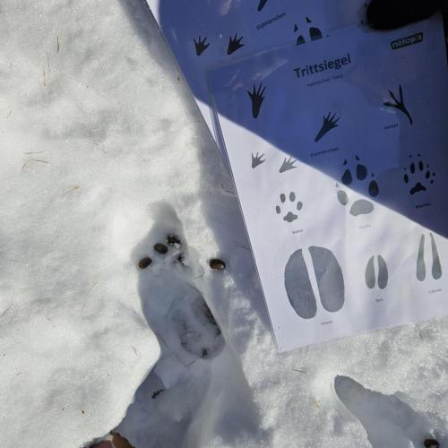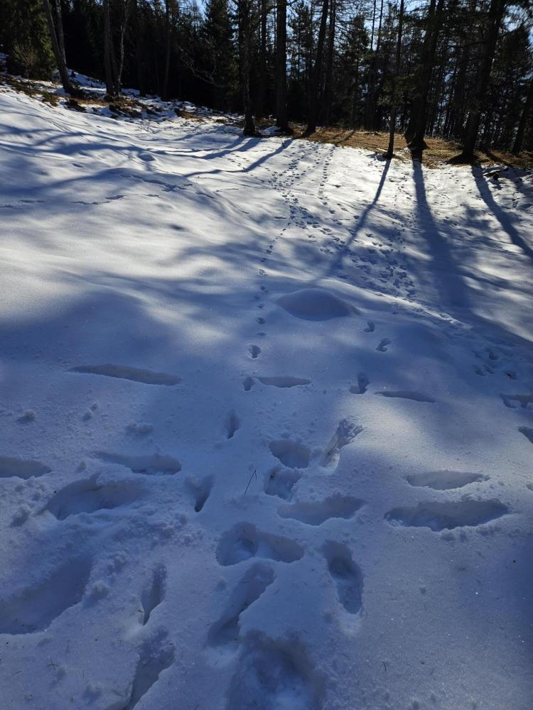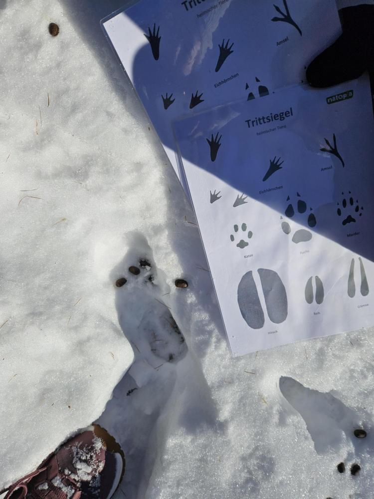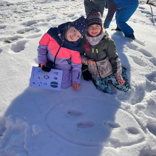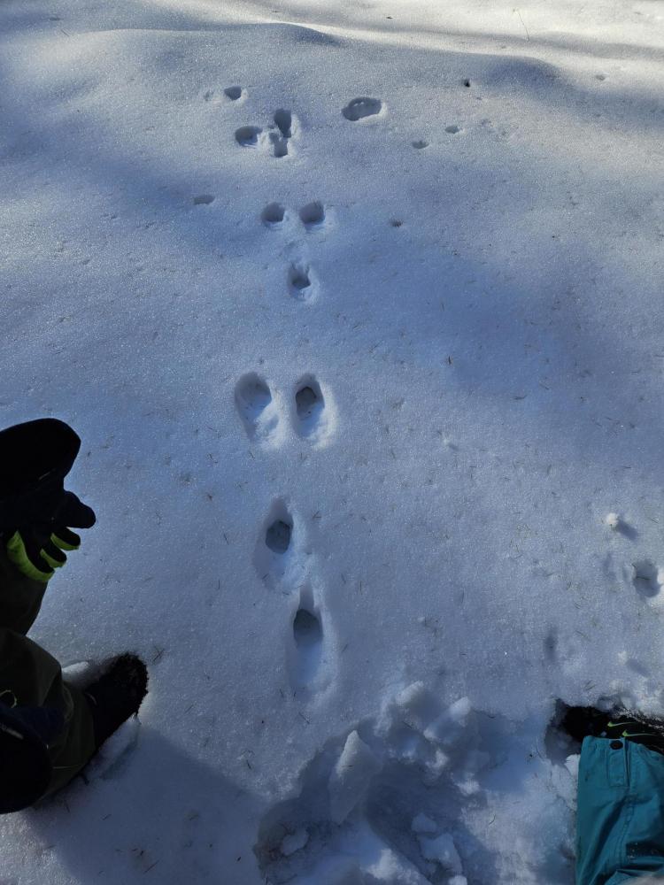 Dann ging es an die echte Spurensuche. Zum Glück lag noch genug Schnee, so wurden mit großer Freude viele Spuren entdeckt. Die Kinder fanden Spuren von Hasen, Rehen und vielen anderen Waldbewohnern.