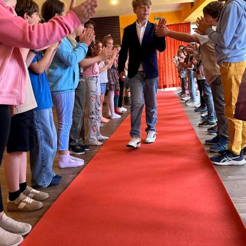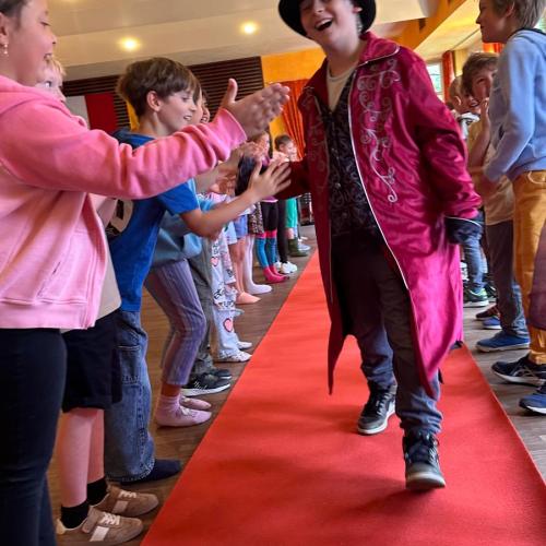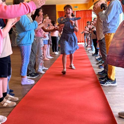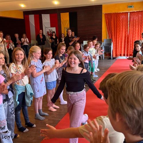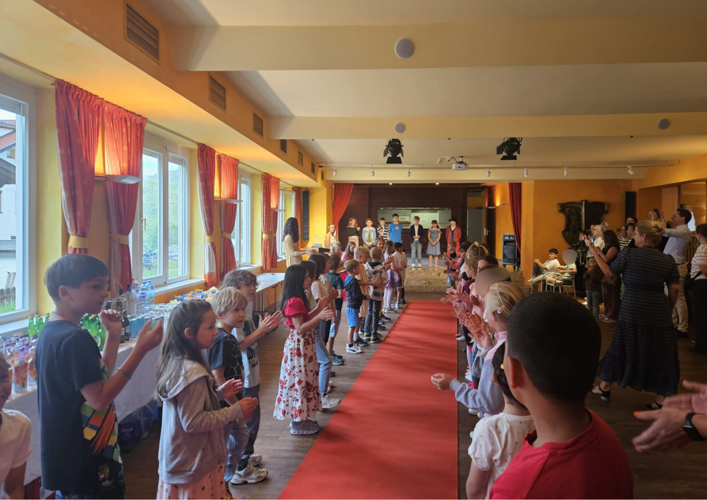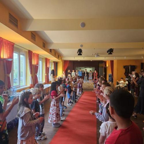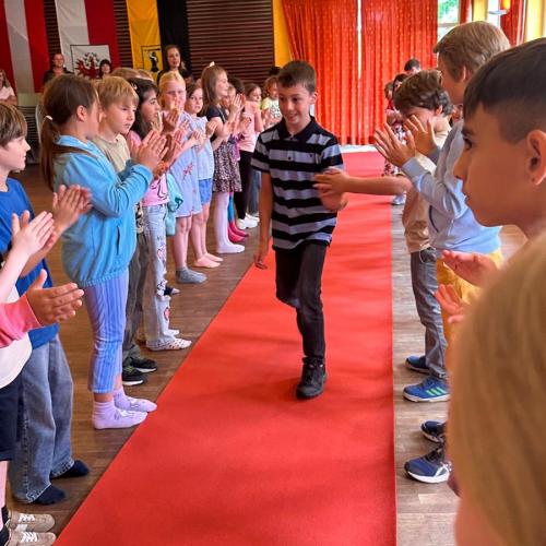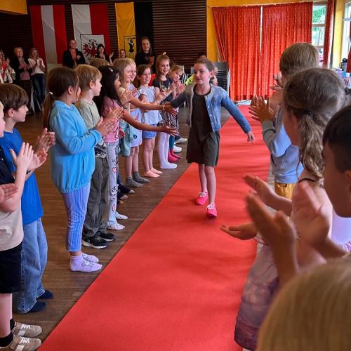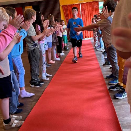 Heute hieß es Abschied nehmen: Gemeinsam verabschiedeten wir unsere Viertklässlerinnen und Viertklässler, die nun bereit sind für ihren nächsten großen Schritt. Unter tosendem Applaus schritten die Kinder über den roten Teppich und ließen sich stolz feiern. Und schon flossen bei dem ein oder anderen ein paar Tränchen. Nach kurzen Abschiedsworten der Lehrerin trugen die Kinder der vierten Klasse ein Gedicht und ein Lied vor. Danach sangen die 1. bis 3. Klasse das bekannte Lied "Wir machen Ferien".