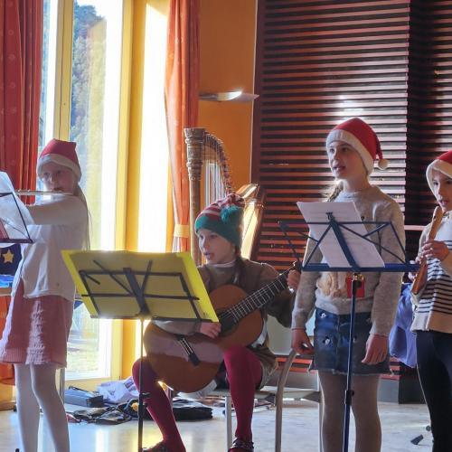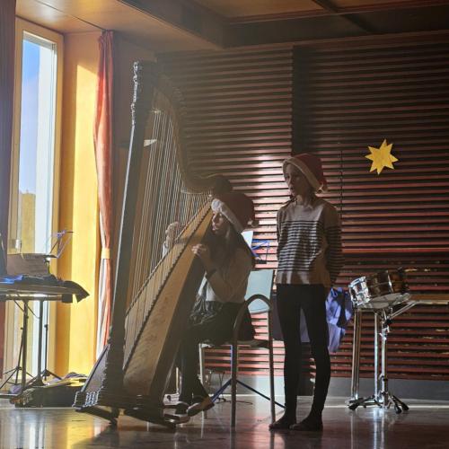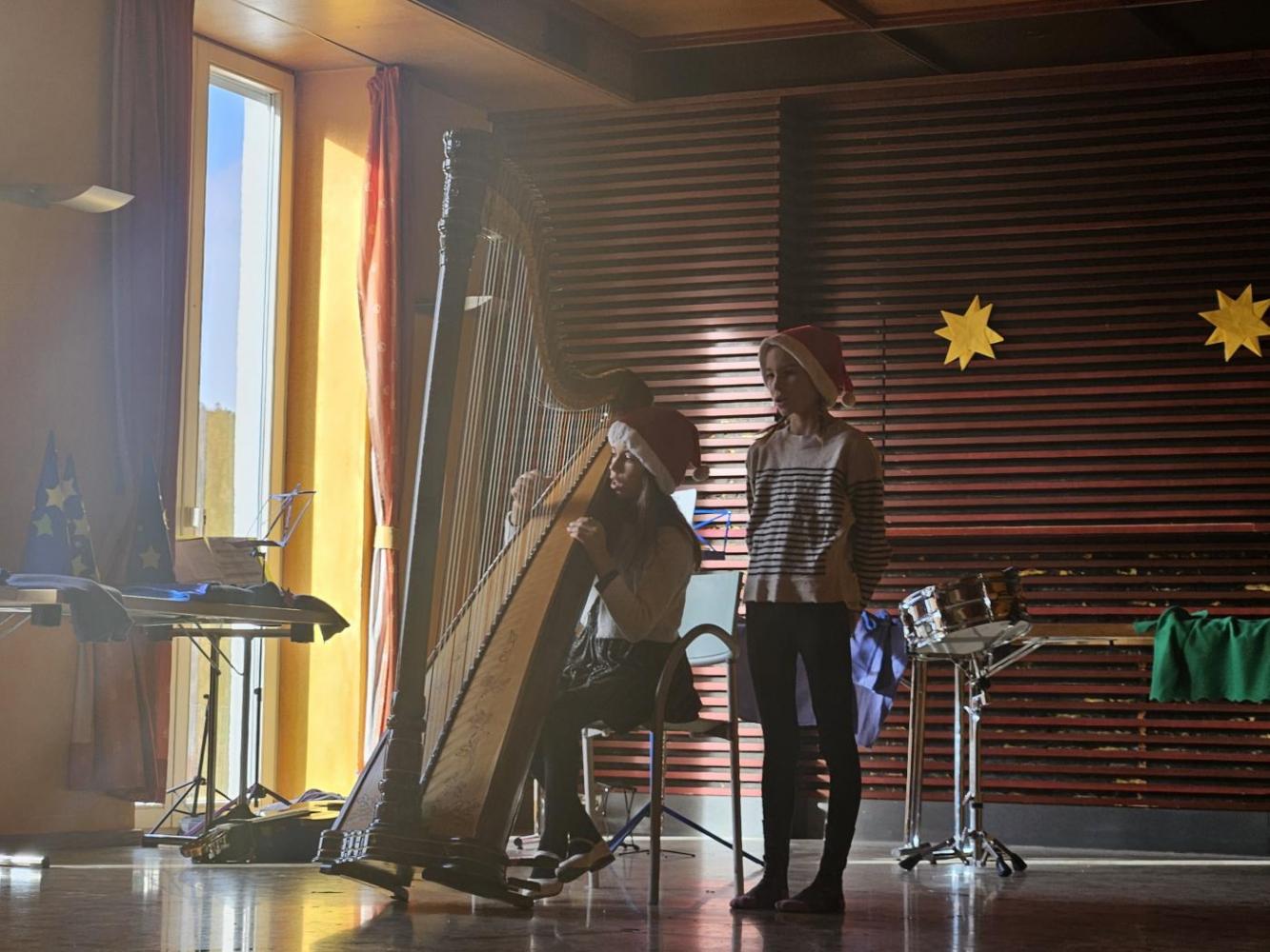 Ein besonderer Beitrag präsentierte eine Schülerin der 4.Klasse, die zwei Lieder auf der Harfe präsentierte und uns so in Weihnachtsstimmung versetzte.